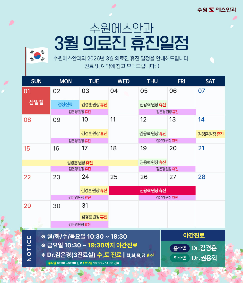 수원에스안과 3월 진료일정 안내